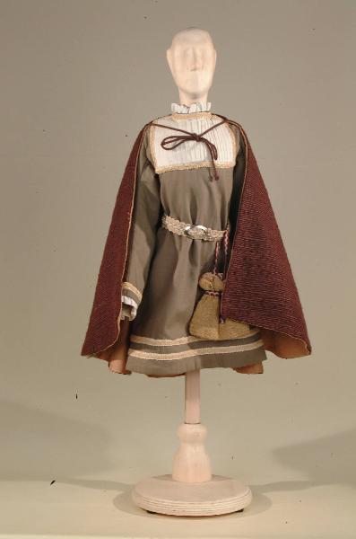 Costume di borghese del '400 costituito da veste, cintura, mantello, borsa.