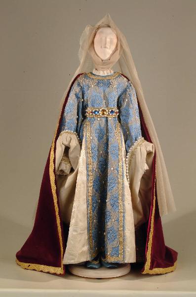 Costume per gentildonna del '400 costituito da veste, mantello, scarpe, velo, soggolo, cintura