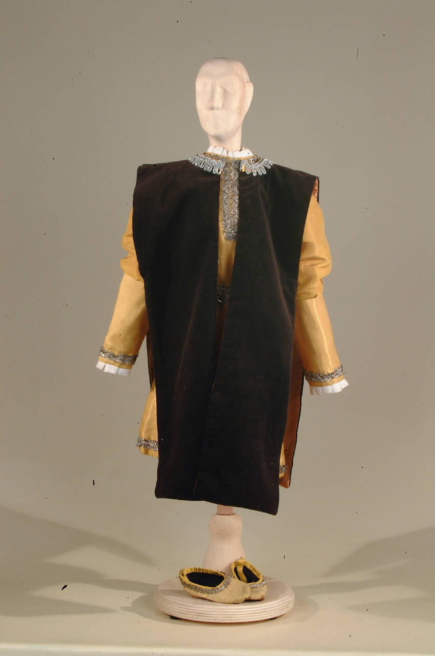 Costume di notabile del '400 costituito da veste, sopravveste, cintura, scarpe