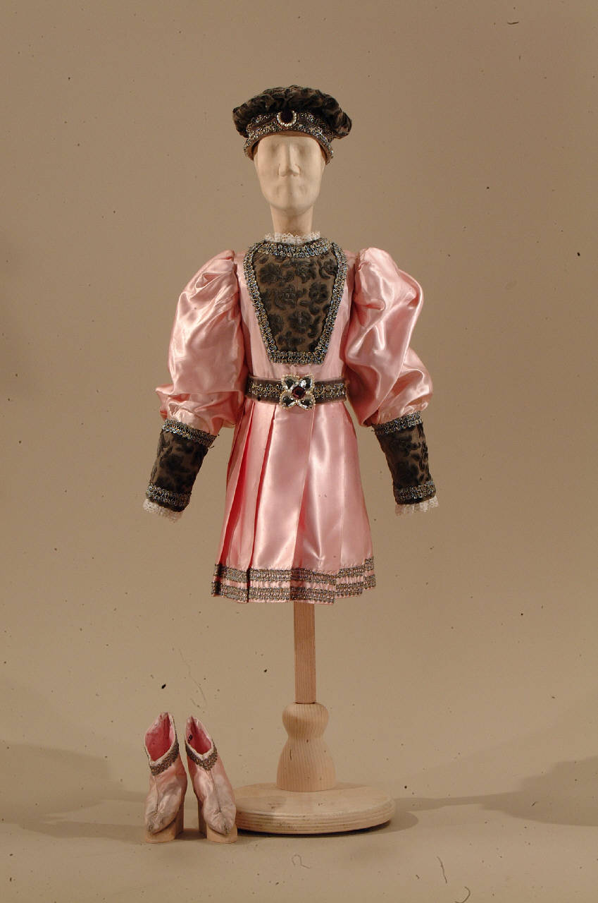 Costume per nobile di foggia rinascimentale composto da veste, cappello, scarpe, cintura con borsetta