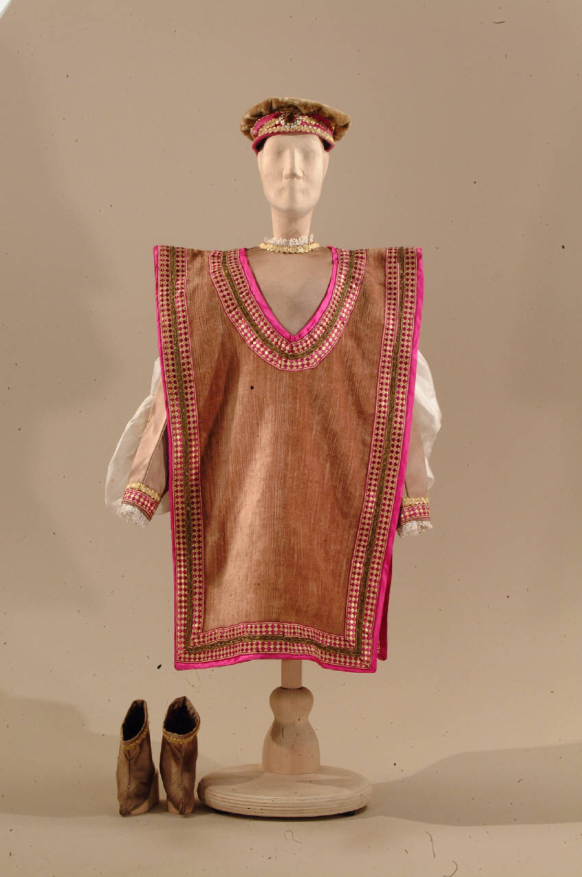 Costume per cavaliere di foggia rinascimentale composto da veste, sopravveste, cappello e scarpe