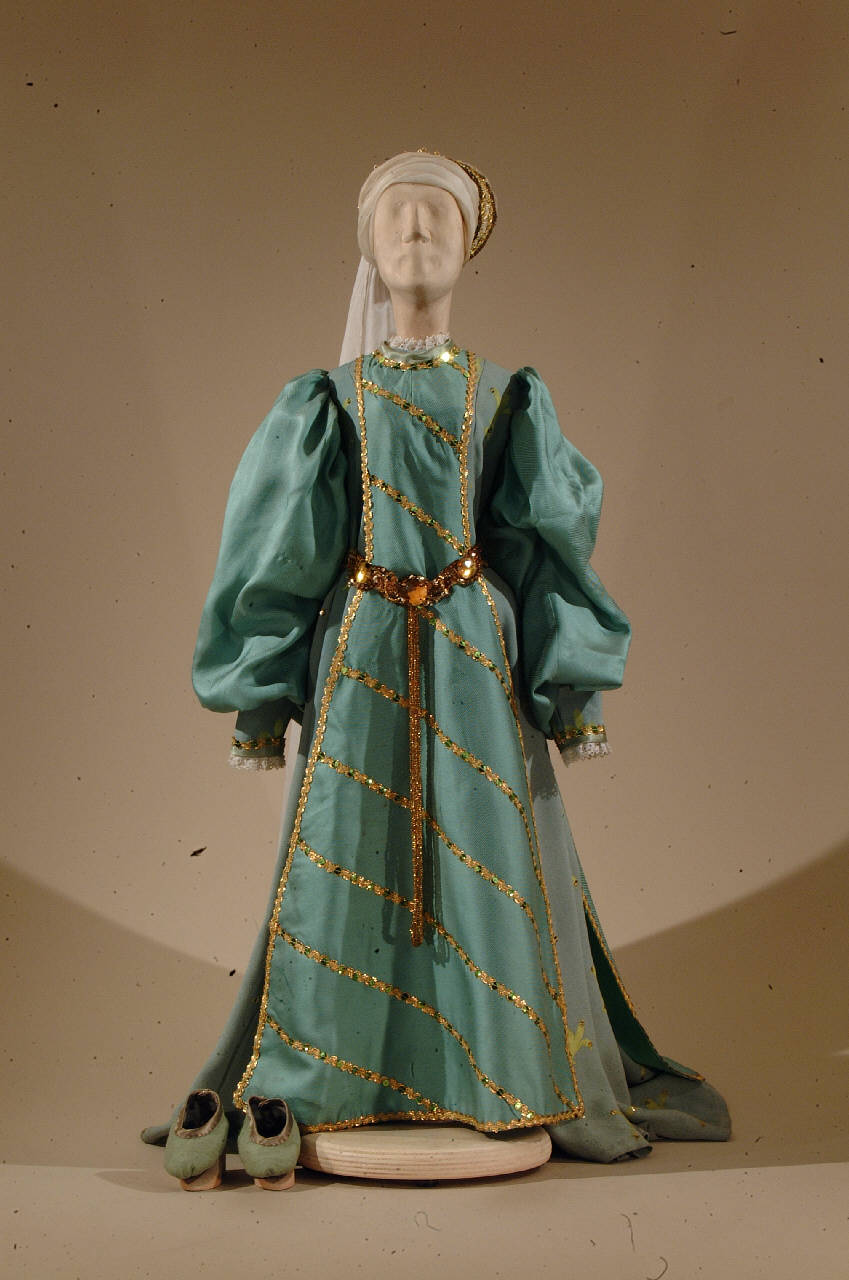 Costume per dama di foggia rinascimentale composto da veste, sopravveste, cintura, cappello, scarpe