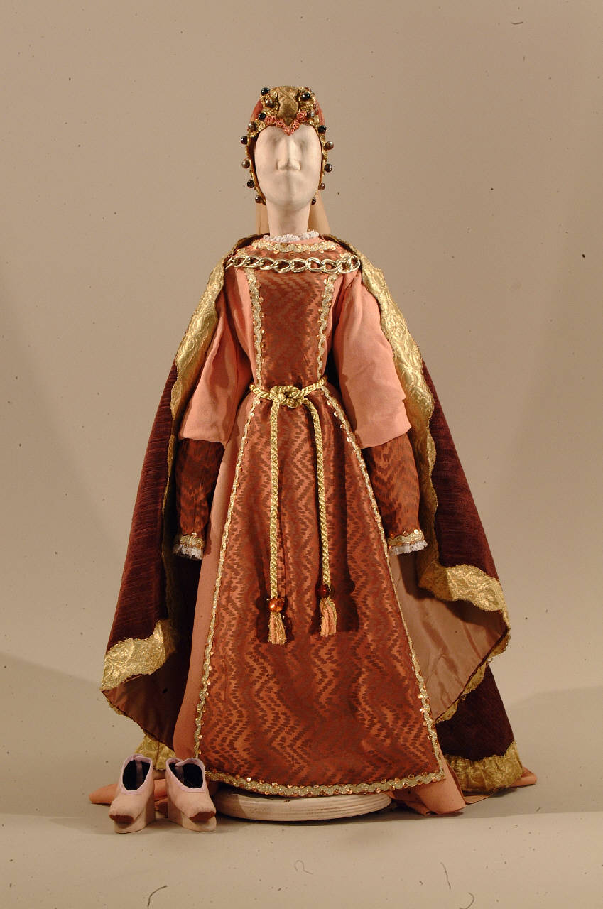Costume per dama di foggia rinascimentale composto da veste, mantello, scarpe e cappello