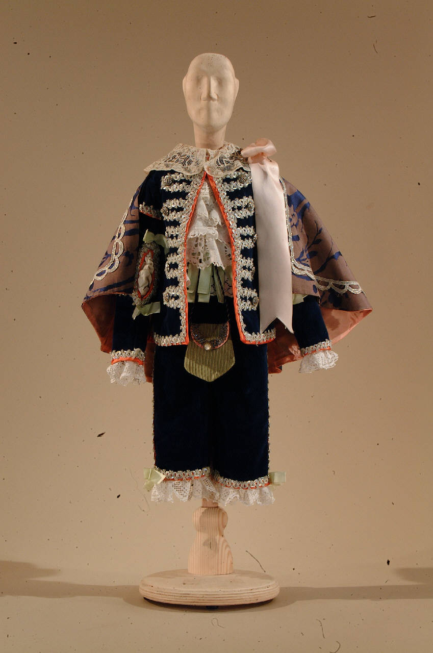 Costume per cavaliere del 1600 composto da pantaloni, giacca, camicia, cintura con borsetta, mantellina, nastro con fiocco