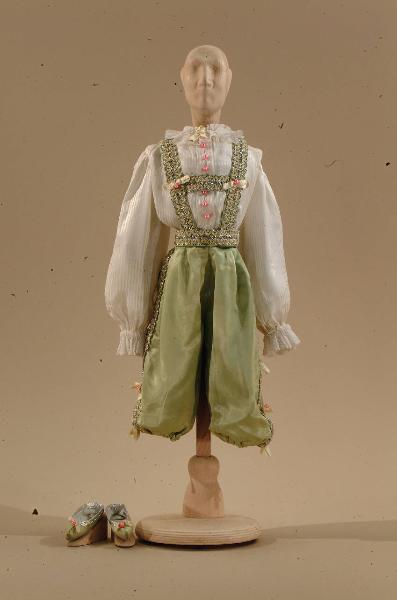 Costume per ballerino inserito in contesto del 1600 composto da pantaloni, camicia, cintura con bretelle, scarpe