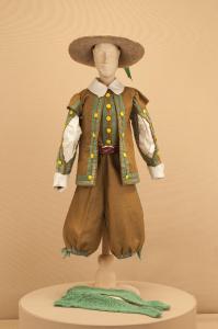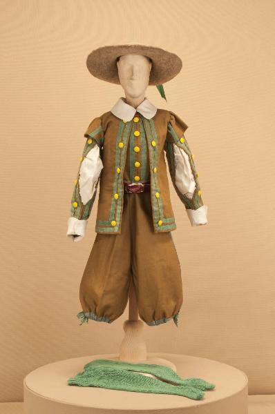 Costume da popolano di foggia seicentesca composto da pantaloni, giacca, gilet, cintura e calze. Si completa con un cappello che ha il codice GOR 07239.