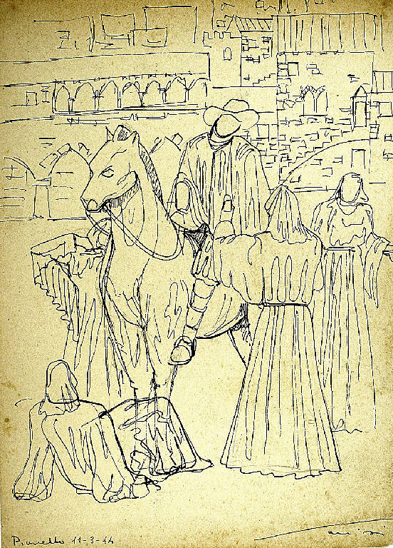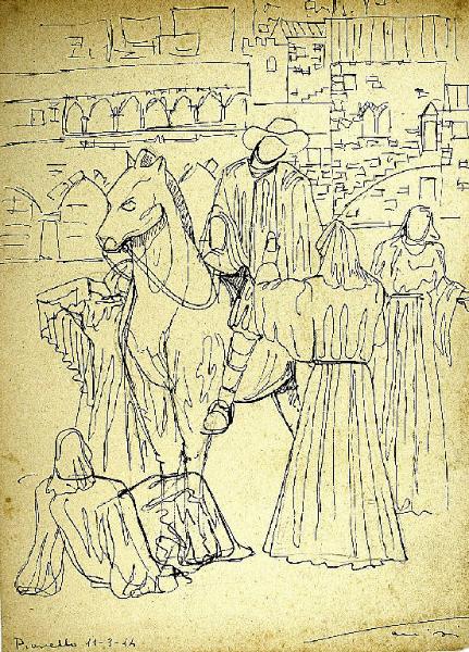 Il cavaliere. Uomo a cavallo e figure con il saio