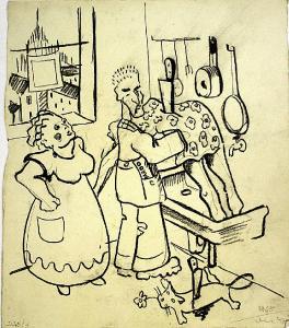 Disegno per il settimanale "La rana". Figure umane e gatto