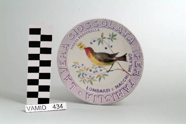 - NOTIZIE STORICO CRITICHE Il piatto pubblicitario, prodotto per la società Lombardi & Macchi di Milano, è decorato con transfer. Le ultime due cifre ("00") presenti nel marchio impresso a tergo, come riporta anche Raffaella Ausenda nel suo libro (cfr "Storia della ceramica nel territorio di Varese dal '700 al '900", 2007, p. 37), riguardano la datazione del corpo ceramico e quindi un sicuro termine post quem.