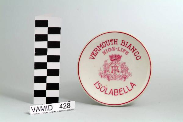 Piatto pubblicitario circolare con iscrizioni in rosso su fondo bianco; bordo rifinito con filettatura rossa.
