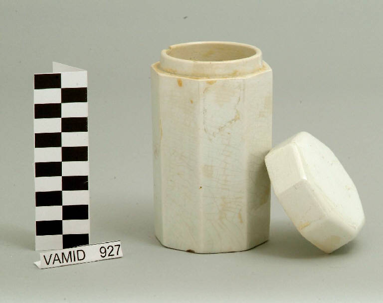 Portaoggetti a sezione esagonale; coperchio esagonale; fondo bianco avorio.