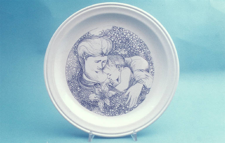 Piatto circolare privo di tesa; fondo bianco decorato con scena sacra (Madonna con Gesù Bambino) in blu.