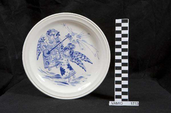 Piatto circolare privo di tesa con bordo rialzato; fondo bianco decorato con angeli in blu.