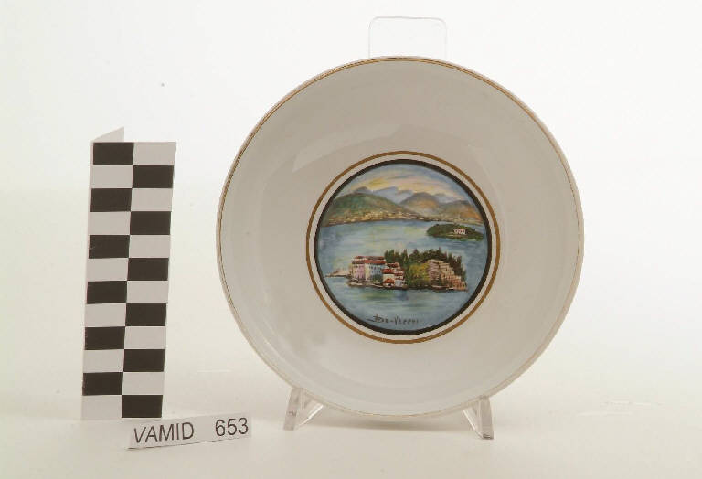 Piatto fondo circolare privo di tesa; fondo bianco decorato al centro del cavetto con una veduta policroma del Lago Maggiore; bordo rifinito con filettatura oro.