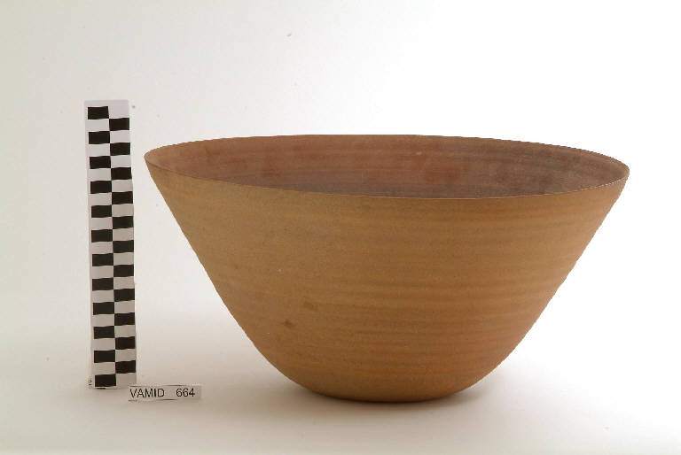 - NOTIZIE STORICO CRITICHE Tipologicamente l'oggetto in esame si lega ad un'altra ciotola (nun. inv. 663). Al suo acquisto ha contibuito la Ceramica Keravem di Monvalle. La manifattura produttrice, "Ceramica Arcore", esegue principalmente ceramiche al tornio o a stampo con lastra. Gli impasti usati sono cotti alla temperatura di 1250° C. ed hanno le caratteristiche del gres porcellanto. La cottura avviene sia in ambiente ossidato che in ambiente riducente. Gli smalti, come gli impasti, sono prodotti in proprio. La riproduzione dei modelli avviene in numero limitato rimanendo coerenti con le loro forme.