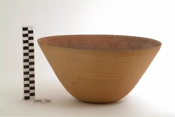Ciotola a sezione circolare con corpo svasato; fondo bruno uniforme.