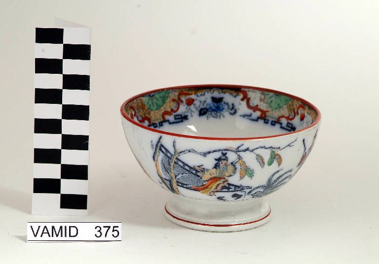 Ciotola bianca decorata all'esterno con scena orientale e lungo il bordo interno con motivi decorativi nei colori nero, rosa, verde, blu e giallo.
