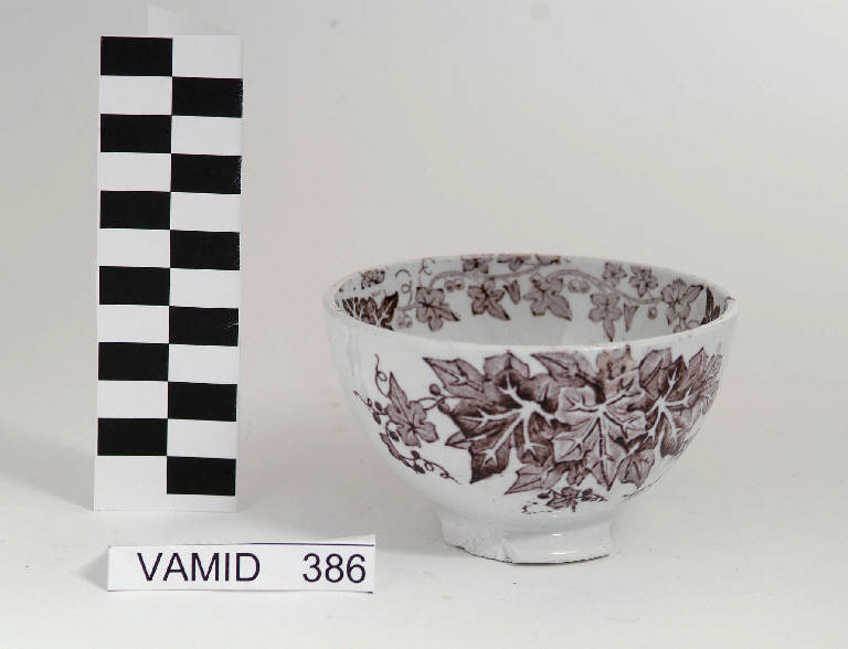 Piccola ciotola decorata all'esterno e all'interno lungo il bordo e sul fondo con motivi vegetali (foglie di edera) in bruno.
