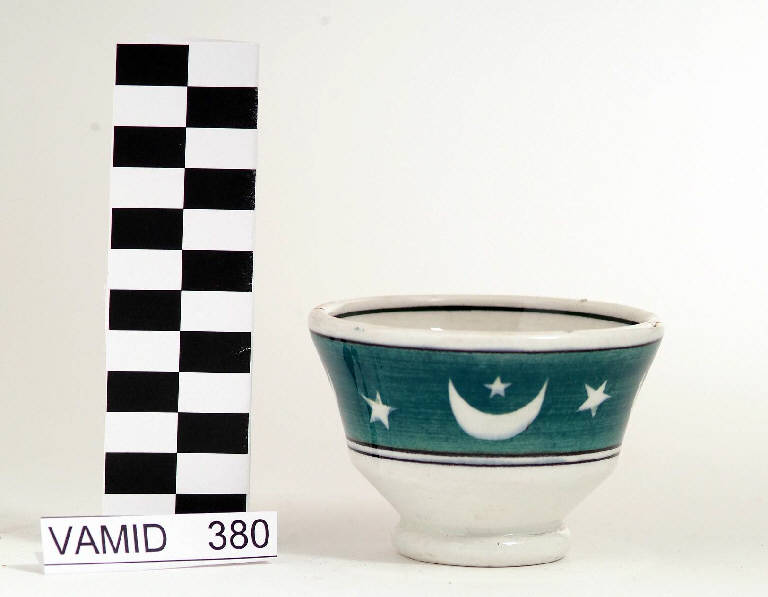 - NOTIZIE STORICO CRITICHE La ciotola da colazione è decorata applicando lo smalto in rilievo, tramite mascherina, in modo da lasciare il motivo decorativo (falci di luna e stelle) in bianco. Il medesimo decoro è presente anche in un'altra ciotola prodotta sempre dalla manifattura Petrus Regout & C. (num. inv. 379) e in altre due ciotole prodotte dalla manifattura Ascold (nn. inv. 1934-1935).