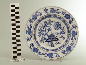 - NOTIZIE STORICO CRITICHE Il piatto fondo in esame è decorato a transfer sottosmalto con un motivo bu cobalto denominato "Meissen". Tipologicamente si lega ad un altro piatto prodotto dalla S.C.I. (nun. inv. 402) e ad un servizio da tavola (nn. inv. 656-657) realizzato dalla Richard Ginori. L'ornato venne spesso utilizzato anche dallo stesso Andlovitz. Le ultime due cifre ("25") presenti nel marchio impresso a tergo, come riporta anche Raffaella Ausenda nel suo libro (cfr "Storia della ceramica nel territorio di Varese dal '700 al '900", 2007, p. 37), riguardano la datazione del corpo ceramico e quindi un sicuro termine post quem.