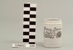 Barattolo per preparazione farmaceutica di forma cilindrica; fondo bianco con scritta "Farmacia Tedesca/ L. Santoro/ 14 Piazza Carolina 14/ NAPOLI" in nero.