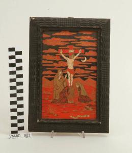 Piastrella di forma rettangolare; fondo bianco decorato con scena della Crocifissione in nero, rosso, bianco e oro.