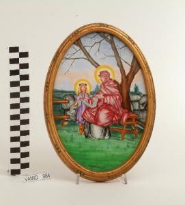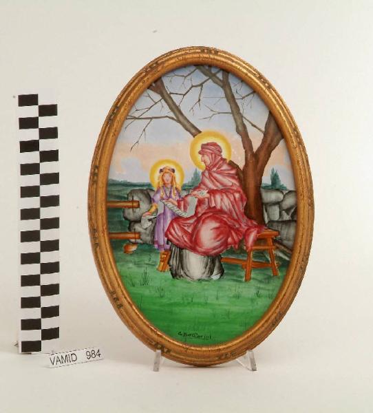 Piastrella di forma ovale; fondo bianco decorato con scena sacra (Sant'Anna insegna a leggere a Maria Vergine) policroma.