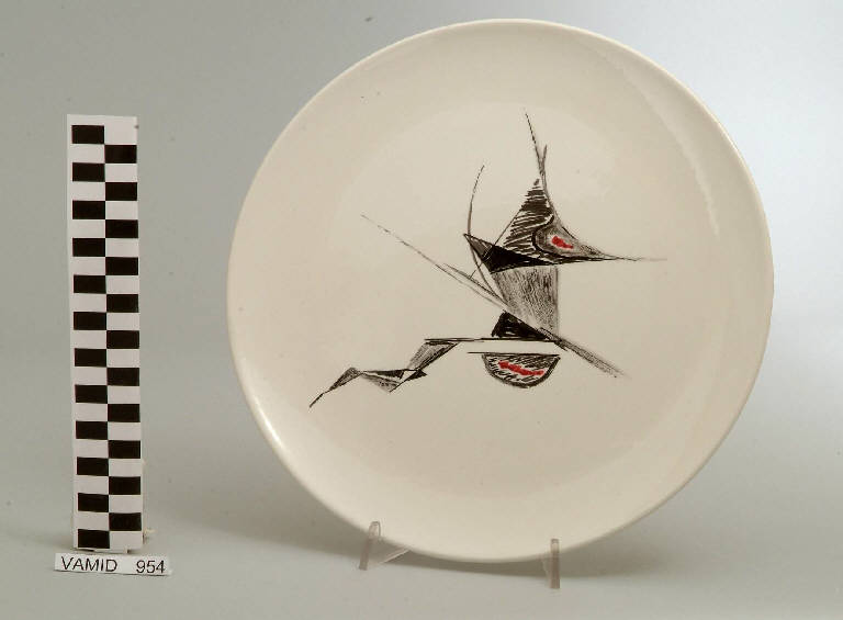 Piatto circolare privo di tesa; fondo bianco con composizione astratta in nero e rosso al centro del cavetto.