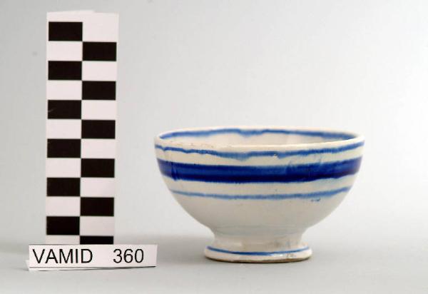Ciotola di colore bianco a sezione circolare con piede circolare. Bordo interno ed esterno dell'imboccatura e scritta "W/ MILANO" in blu.