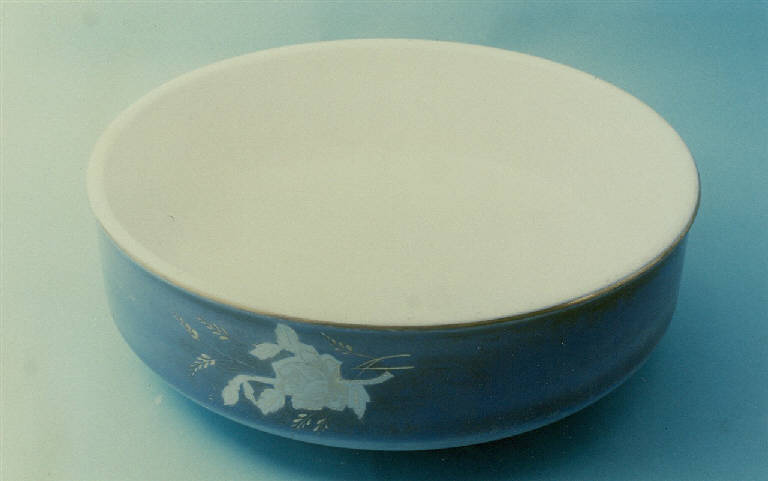 Catino lavamano con corpo cilindrico; bordo leggermente estroflesso; fondo blu cobalto decorato con mazzo di rose a risparmio e foglioline in oro all'esterno; bordo rifinito con filettatura oro; bianco internamente.