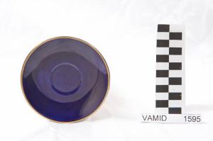 Piattino circolare; fondo blu cobalto; bordo rifinito con filettatura oro.