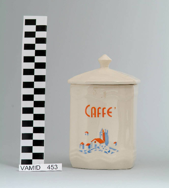 Barattolo a sezione quadrata con coperchio; fondo bianco avorio decorato su un lato con paesaggio con chiesa in azzurro e arancio; scritta "Caffè" in arancio.