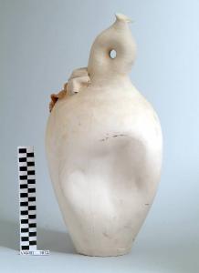 Vaso con corpo schiacciato; piede circolare; foratura nel collo; fondo bianco.