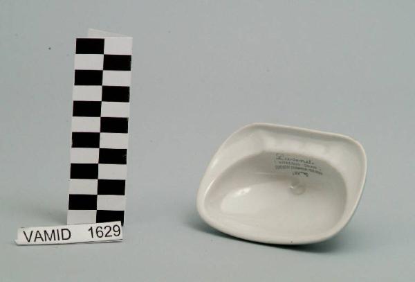 - NOTIZIE STORICO CRITICHE Si tratta di un oggetto pubblicitario con scritta sottosmalto. Il museo possiede un altro pezzo identivo (n. inv. 1628). La porcellana vetrosa (vitreous china) è il materiale più pregiato per la realizzazione di sanitari e nasce negli Stati Uniti. Ha caratteristiche intermedie fra quelle della porcellana e quelle del gres d'impasto. Un¿impasto è costituito da caolino, argilla , silice, feldspati e minori quantità di calcite, dolomite o talco. E' inattaccabile dagli acidi, impermeabile, vitrea e traslucida ma, presentando un alto grado di ritiro alla cottura, non può essere utilizzata per eseguire elementi di grandi dimensioni come vasche o piatti doccia. Le sue particolari caratteristiche sono la traslucidità, cioè la capacità di farsi attraversare dalla luce, e il colore, originariamente bianco o in seguito colorato o ricoperto da vernice trasparente.