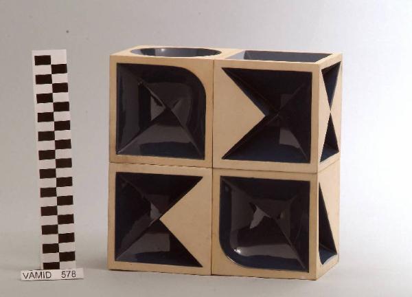 Scultura formata da quattro cubi regolari, aventi incavi geometrici sulle varie facce e incollati insieme a formare un parallelepipedo. Decorazione basata sulla contrapposizione tra zone incavate smaltate in blu lucido e zone dove il materiale e' lasciato allo stato grezzo.