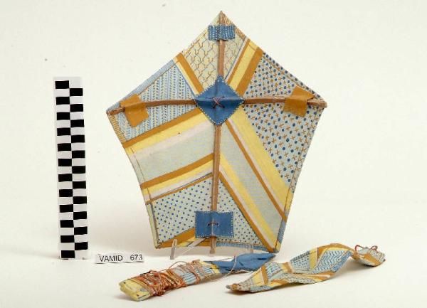 Scultura raffigurante un piccolo aquilone tenuto insieme da fili rossi e composto da tre pezzi.