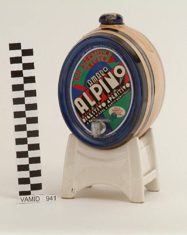 - NOTIZIE STORICO CRITICHE Questa originale botticella fu acquistata nel 1989 da Albino Reggiori alla Casa d'aste Sotheby's di Milano. L'oggetto, progettato dalla ditta dell'Amaro Alpino, fu eseguito nel prototipo da Antonia Campi, allora direttore artistico della Società Ceramica Italiana (24 aprile 1962). Il decoro, che ricalca quello originale della ditta Alpino degli anni Trenta, fu eseguito a decalcomania serigrafica a piu' colori dalla ditta Didone di Lambrate (MI). Di questo oggetto pubblicitario esistono i gessi madre che provengono dalla fabbrica Lago della S.C.I.
