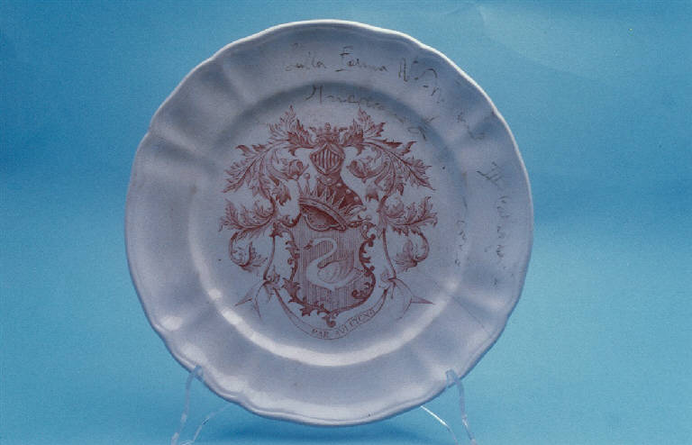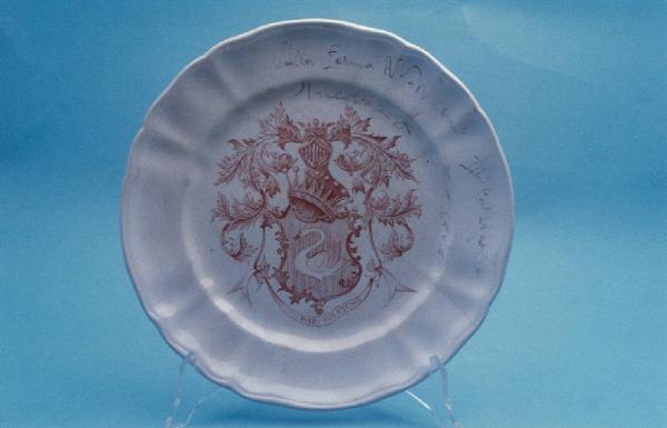 Piatto piano con tesa leggermente ondulata; fondo bianco con stemma araldico nel centro e motto. E' presente anche una iscrizione a penna sulla tesa.
