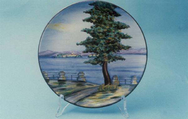 Piattino da parete leggermente concavo e senza tesa; decorazione dipinta a mano sopra vernice raffigurante una veduta del lago con albero in primo piano.