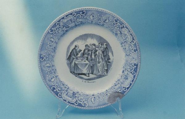 Piatto con tesa piatta; fondo bianco decorato a motivi decorativi con uccelli e piccole vedute in blu sulla tesa e con una scena matrimoniale in nero sul cavetto.