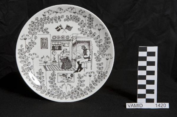 Piatto senza tesa di colore bianco decorato con scena domestica contornata da tralci di foglie e campanule.