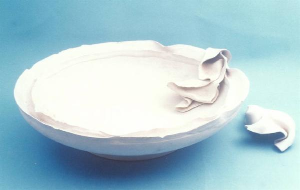 Fruttiera con bordo lamellare e cartiglio increspato su un lato.