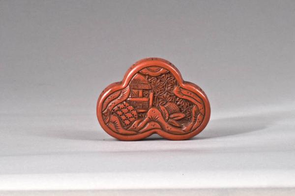 Netsuke che simula una scatoletta (hako) trilobata in legno intagliato e laccato. Le due facce più ampie mostrano entrambe un paesaggio con rocce e vegetazione: in una veduta è visibile anche un padiglione. Lungo tutto il lato basso corre invece un fregio a meandro di greca. I due fori per il passaggio del laccio (himo) sono disposti uno al centro di una delle due facce, l'altro su un lato della scatoletta.