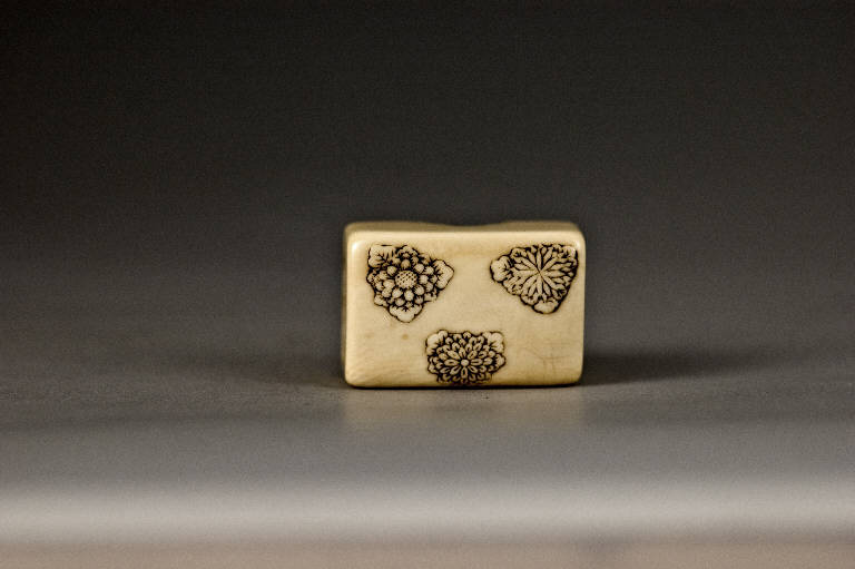 Netsuke di tipo manju nella variante 'a scatola' (hako). Riproduce un contenitore con coperchio in lacca. La decorazione si limita a tre gruppi di fiori in rilievo sul lato superiore del coperchio.