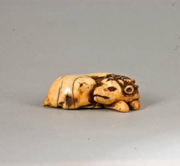 Netsuke in avorio raffigurante un cervo sdraiato, con la testa posata sulle zampe anteriori piegate. I due fori dell'himotoshi, uno di dimensioni maggiori rispetto all'altro, sono ubicati sul lato inferiore della composizione.