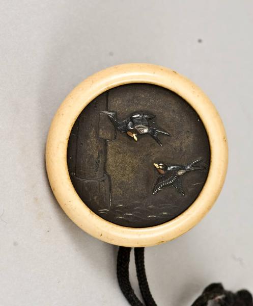 Netsuke di tipo kagamibuta con cornice in avorio e piastra in metallo parzialmente dorato; su quest'ultima è raffigurata una scena con due rondini a volo basso sul corso di un fiume, nei pressi del pilone di un ponte.