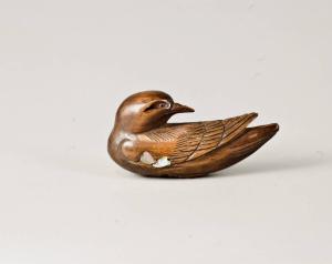 Netsuke raffigurante una colomba accovacciata sulle proprie zampe; in prossimità del petto si vedono tre inserti in madreperla (raden). Dei due fori dell'himotoshi, il maggiore si trova in prossimità di un'ala del volatile, l'altro sul lato inferiore, in corrispondenza del ventre.