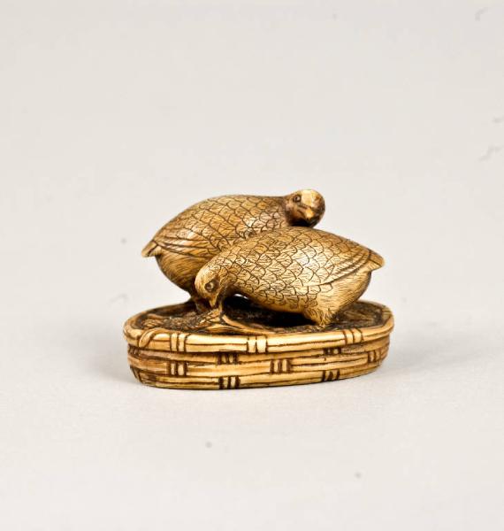 - NOTIZIE STORICO CRITICHE I netsuke di quaglie più noti furono realizzati da Okatomo, artista attivo a Kyoto (v. inv. n. 5680); un suo pezzo con questo soggetto, molto simile per impostazione a questo esemplare della collezione Lanfranchi, è illustrato in Barry Davies Oriental Art 1996, n. 40.\nNessuno dei due Mitsumasa elencati dal Davey (1974, p. 497, nn. 1616-1617) può essere associato con l'autore di questo pezzo.