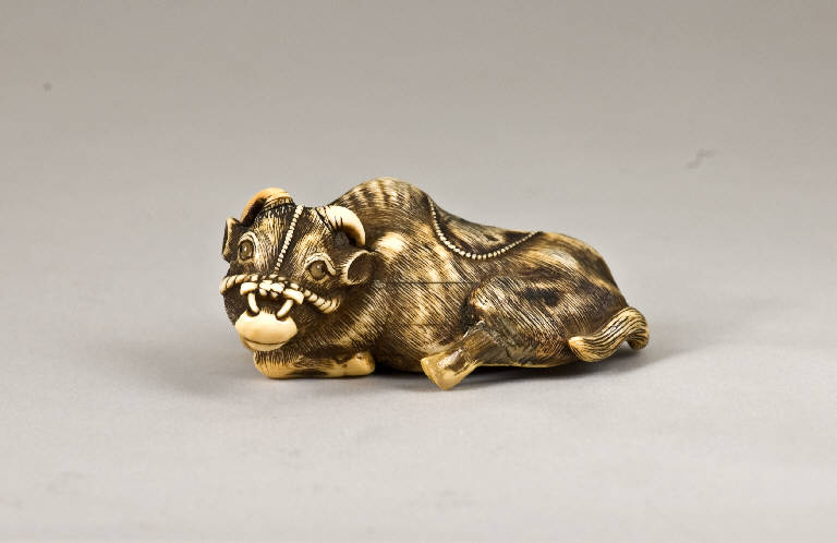 Netsuke raffigurante un bue sdraiato, con il capo rivolto a sinistra; gli occhi sono intarsi di ambra, mentre le pupille sono inserti di corno; la zampa posteriore sinistra è stata riagganciata con un restauro. I due fori dell'himotoshi, uno di dimensioni maggiori rispetto all'altro, si trovano sul lato inferiore della composizione.