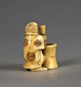 Il pezzo raffigura una lepre (usagi) vestita di un abito decorato con grandi fiori di crisantemo (kiku) intenta a pestare il riso nel mortaio per preparare il dolce chiamato mochi.